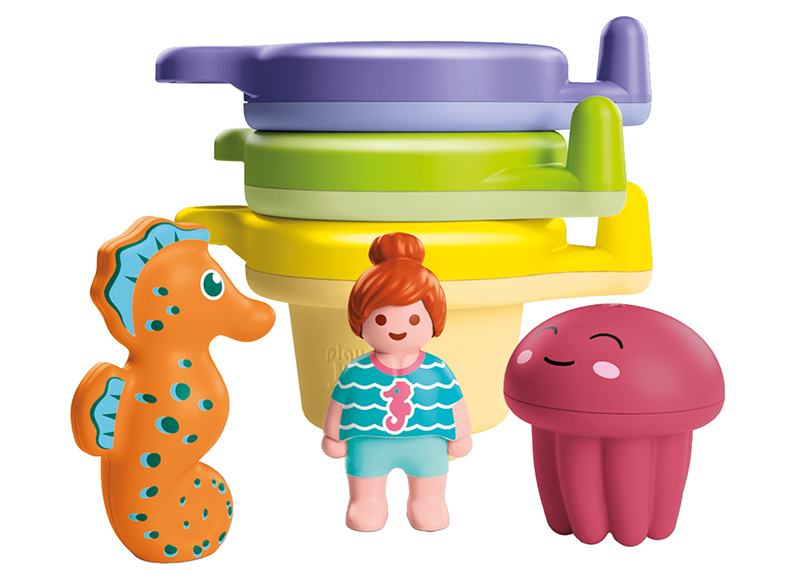 Samenstelling 3 kleurrijke bekers, 1 speelfiguurtje, 1 kwal, 1 zeepaardje.