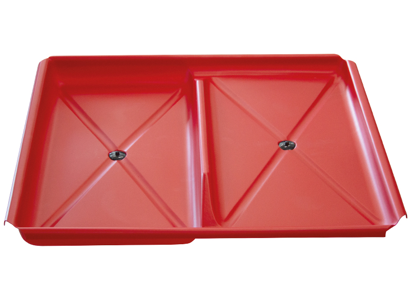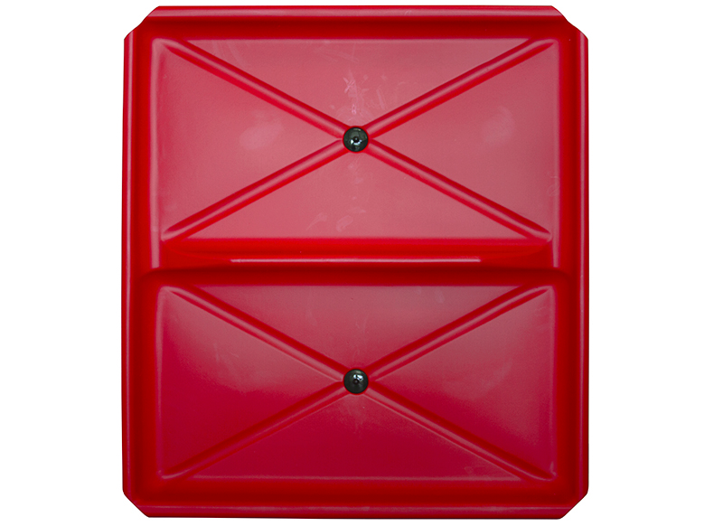 Deze rode plaat past op het metalen raamwerk onder de watertafel en dient voor het opbergen van het gebruikte speelgoed.