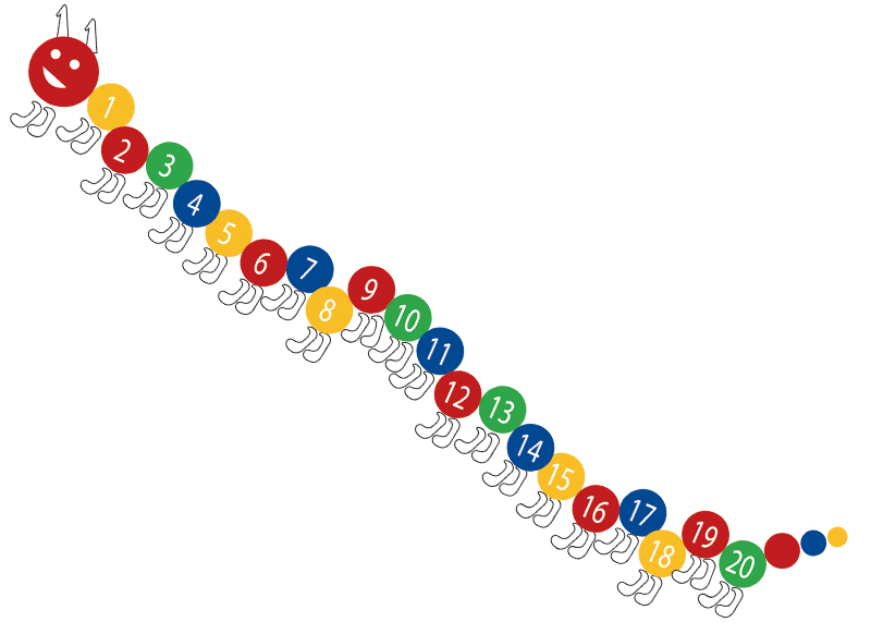 Laat jouw leerlingen het kronkelende parcours afleggen van deze rups! Tegelijkertijd leren zij ook tellen tot 20.