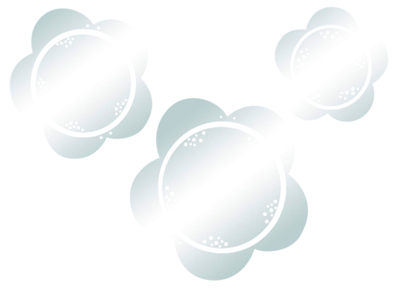 Spiegelende madeliefvormige panelen in verschillende maten voor het experimenteren met markeringen, licht en reflecties.