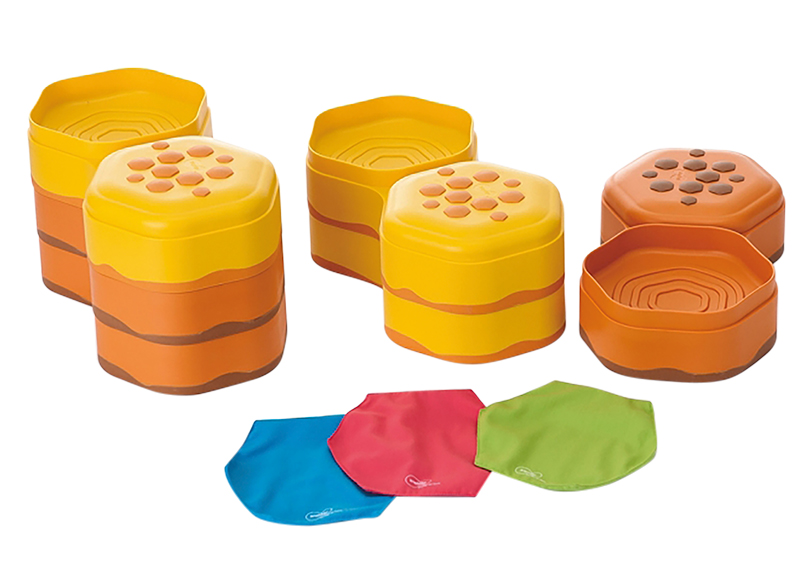 Samenstelling 6 honingheuvels en 3 voelzakjes. Tactiele materialen niet inbegrepen.