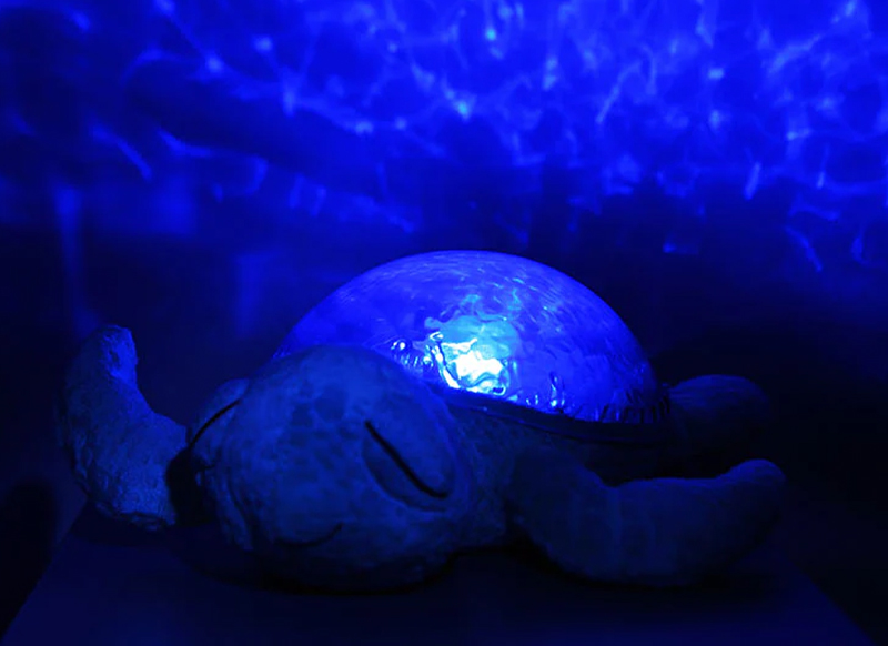 De Tranquil Turtle is een rustgevend nachtlampje dat oceaangolven op het plafond projecteert en rustgevende geluiden speelt.
