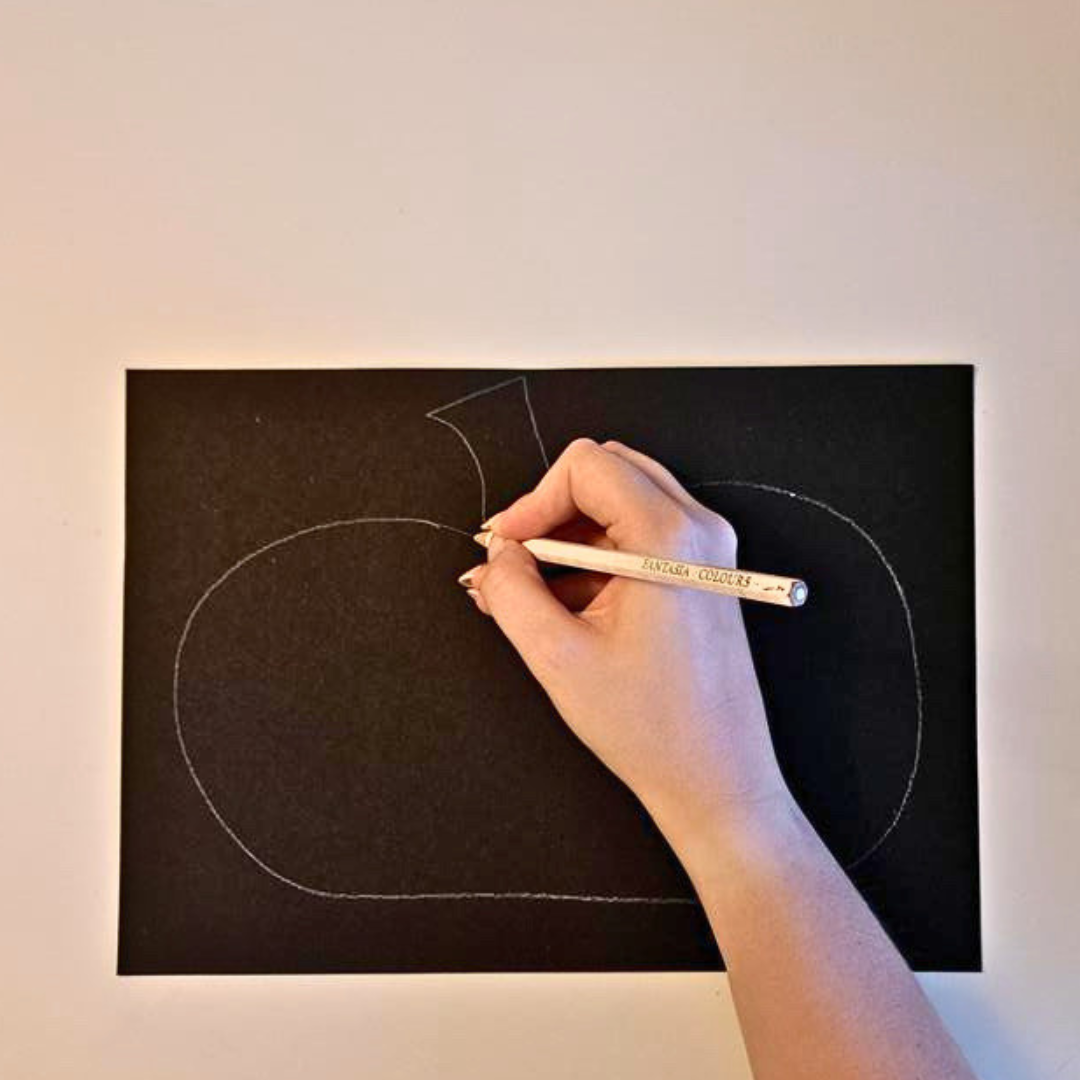 Gebruik een wit potlood om de vorm van een pompoen te tekenen op een stuk zwart knutselkarton.