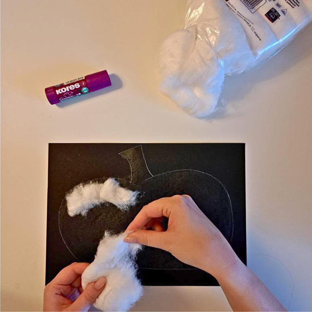 Beplak de binnenkant van de pompoenvorm met watjes. Zorg dat ze elkaar mooi overlappen.