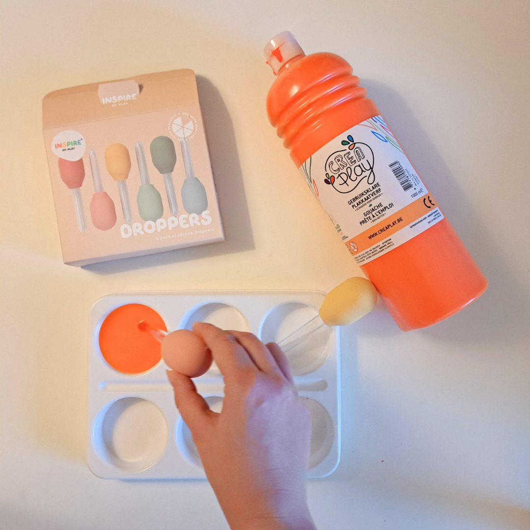 Meng oranje en groene verf elk met een beetje water in je verfpallet. Zo kun je de kleuren makkelijk aanbrengen met een pipet.