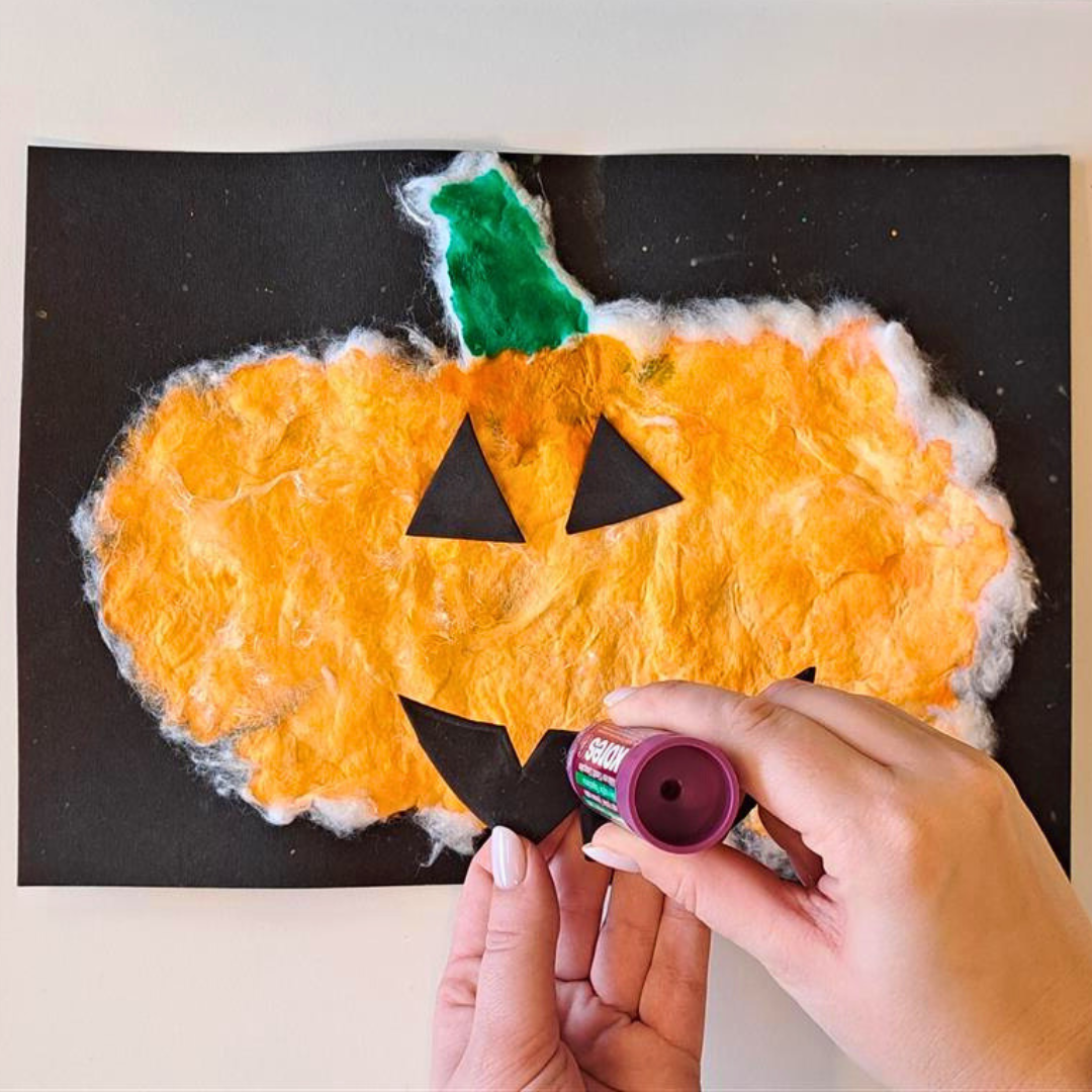 Knip ogen en een mond uit zwart knutselrubber en plak deze op de gedroogde watjes. Zo krijgt je pompoen een echte Halloween-look!