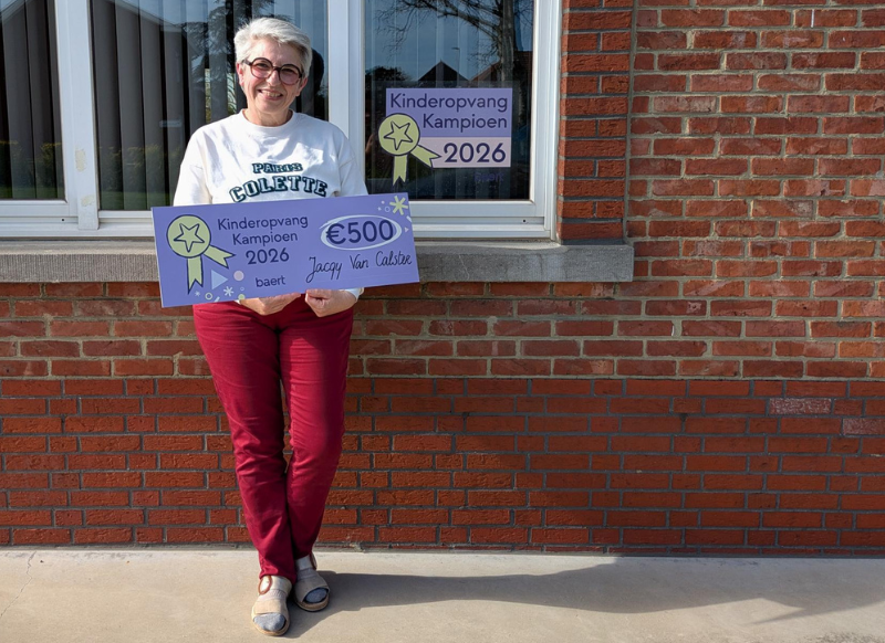 Daarom ontvangt Jacqy naast haar titel en toffe raamsticker ook een Baert-cadeaucheque van 500 euro, die ze kan inzetten om haar warme opvang nog verder aan te vullen en te verrijken voor de kinderen.